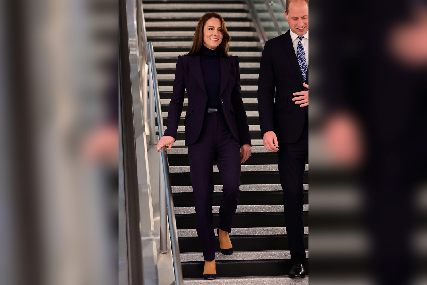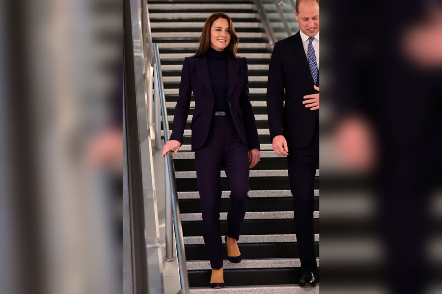 Для первого выхода в аэропорту Бостона 40-летняя принцесса Уэльская выбрала брючный костюм британского дизайнера Alexander McQueen и водолазку в тон. Образ дополнили серьги с сапфирами и бриллиантами принцессы Дианы. Герцогине сделали укладку с прямыми локонами. Принц Уильям дополнил свой темно-синий костюм галстуком с принтом и черными туфлями.