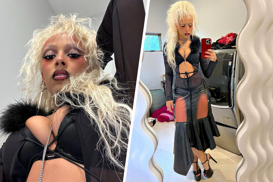 Doja Cat появилась на публике в необычном образе. Певице надели парик с «рваными» блондинистыми прядями и сделали яркий макияж с тонкими нарисованными бровями и угольно-черными стрелками. Перед камерой она позировала в «голом» платье с перьями, отделкой из кожи и разрезом на животе. Образ дополнили массивные серебряные украшения с крестами и серьги, черные лаковые туфли на высоком каблуке.