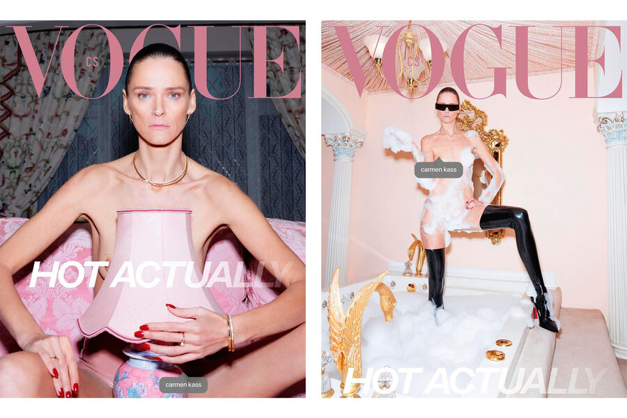 Чехословацкая версия журнала Vogue представила две обложки февральского номера — для них обоих снялась 44-летняя эстонская топ-модель Кармен Касс. На одной из них Кармен предстала топлес, в одних трусах из розового латекса, прикрывая грудь абажуром. На другой Касс позировала обнаженной в наполненной пеной ванне — на ней были лишь солнцезащитные очки и высокие латексные сапоги на каблуке.