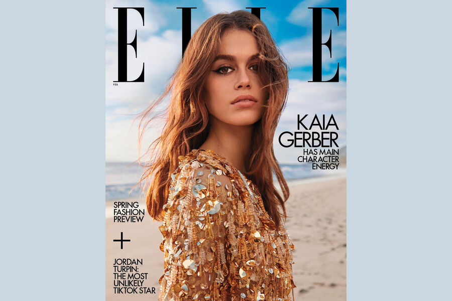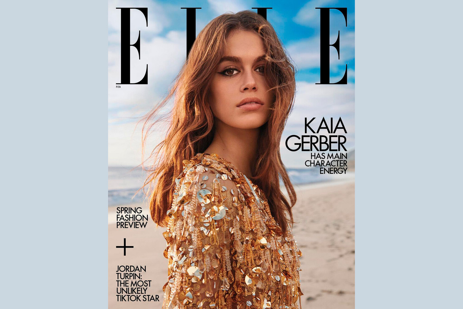 Кайя Гербер стала героиней февральского номера Elle USA. 21-летняя дочь Синди Кроуфорд позировала для обложки журнала в мини-платье, расшитом пайетками, и кожаных ботинках Celine. На другом снимке девушка предстала в откровенном платье Vaquera с американским флагом, надетом на голое тело, и без обуви.
