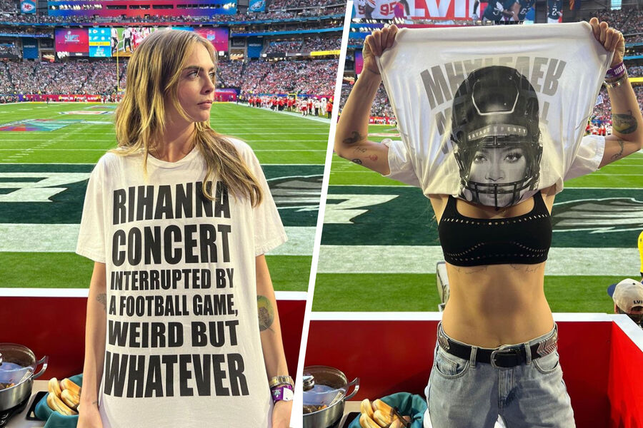 30-летняя Кара Делевинь пришла на трибуны в мерче, выпущенном брендом Savage x Fenty специально к «Супербоулу». На ней была майка с надписью «Футбольный матч посреди концерта Рианны — это странно, но ничего страшного» на лицевой стороне и портретом певицы в шлеме для американского футбола — на изнаночной. В один момент звезда задрала ее, заодно продемонстрировав нижнее белье и пресс.