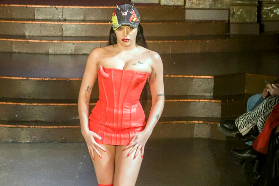 26-летняя Лурдес вышла на подиум в корсетном мини-платье красного цвета с дьявольскими рогами на груди. Его дополнили бейсболка с шипами, гольфы и остроносые туфли на каблуке.
