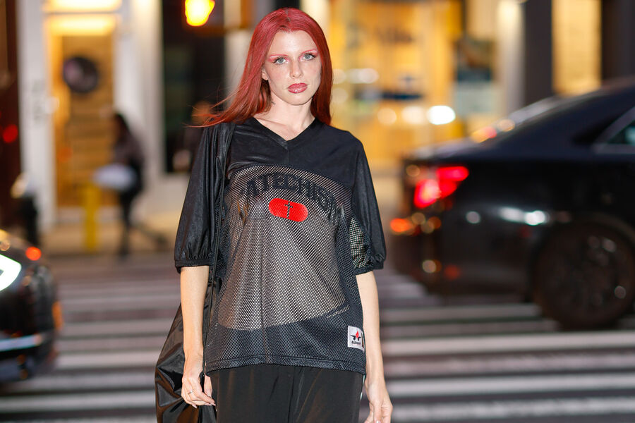 33-летняя актриса продемонстрировала новую прическу и красные брови на показе Willy Chavaria, который прошел в рамках Недели моды в Нью-Йорке. Бывшая подруга Канье Уэста позировала фотографам в спортивной футболке в сетку, которую она надела на голое тело, черных спортивных штанах и лакированных сапогах на каблуке.