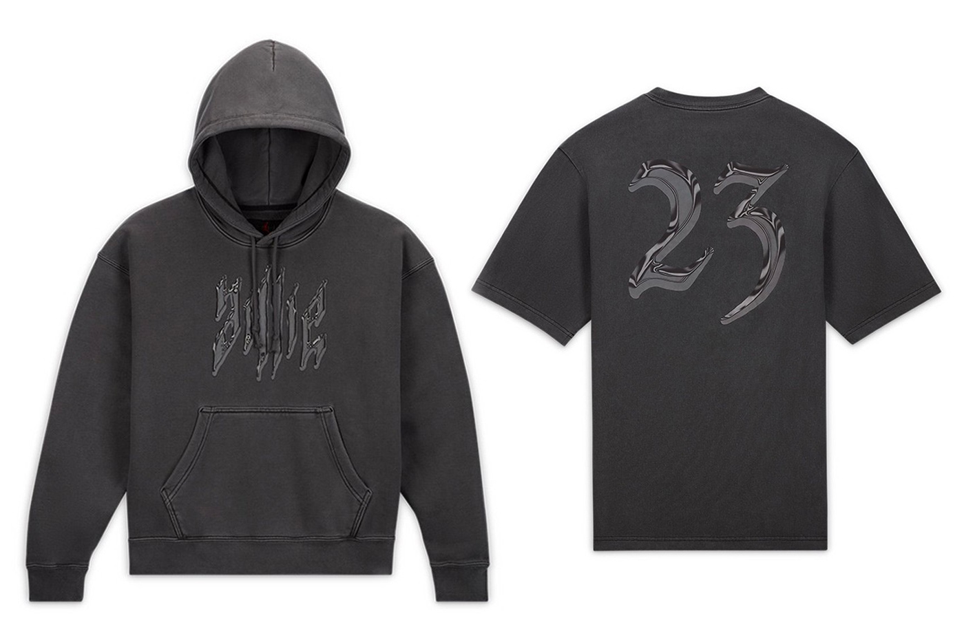 В новой коллекции будут представлены теплая флисовая толстовка, спортивные штаны и футболка. Вещи изготовлены с использованием выцветшей черной краски, которая придает изделиям винтажный стиль. На одежду нанесена цифра 23, выполненная в стиле гранж, и логотип бренда.