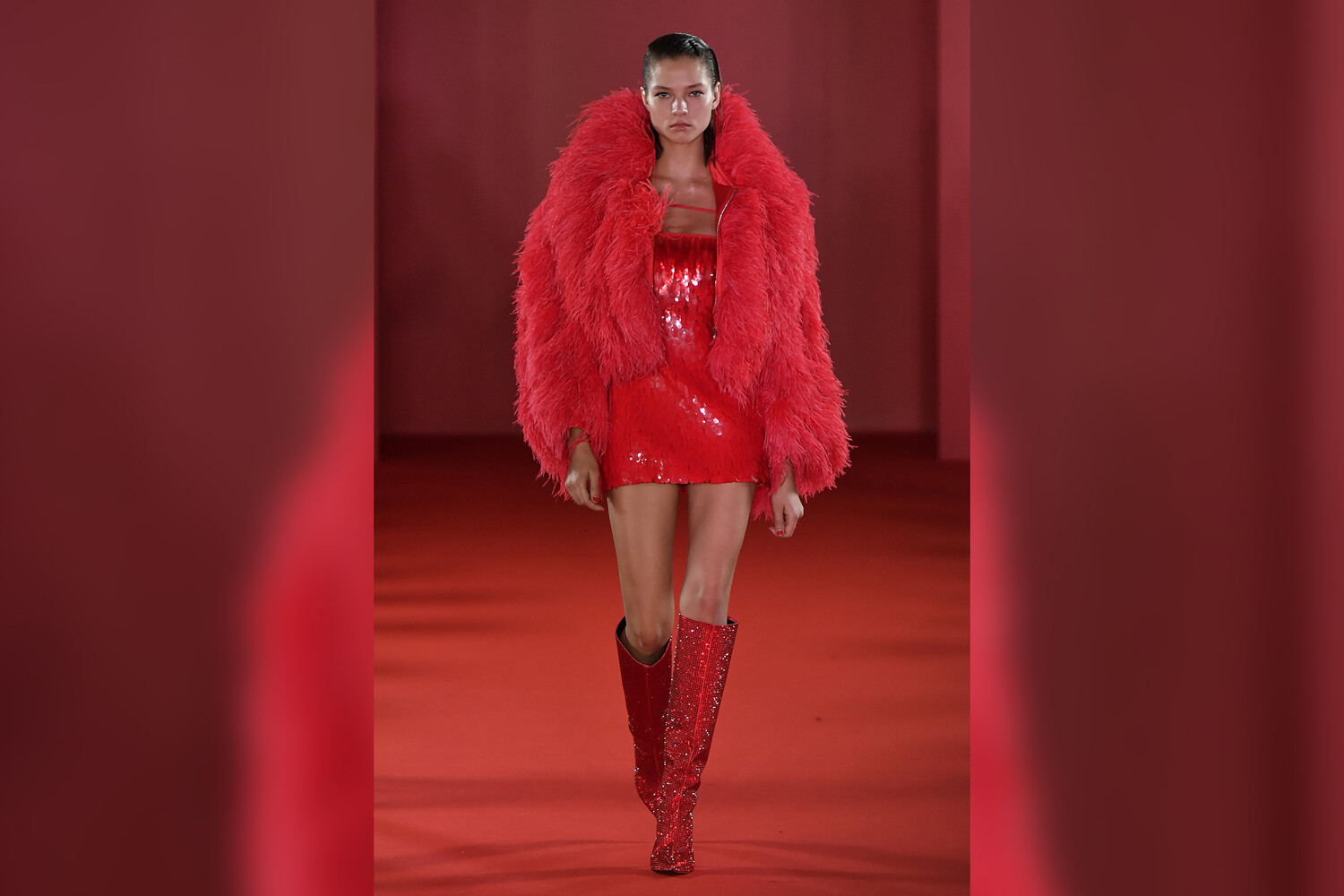 24-летняя Алеся Кафельникова вышла на подиум во время показа новой коллекции David Koma сезона осень-зима 2023-2024. На ней были короткое красное платье, расшитое пайетками, шуба с перьями и сапоги со стразами.