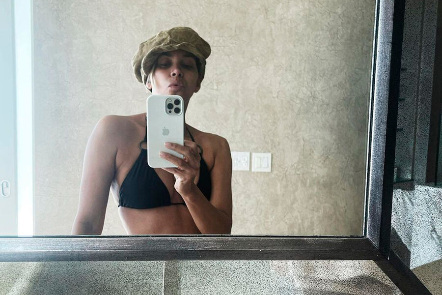 56-летняя Холли Берри выложила в социальных сетях фото, на котором запечатлена по пояс в кепи цвета хаки и черном лифе от купальника.