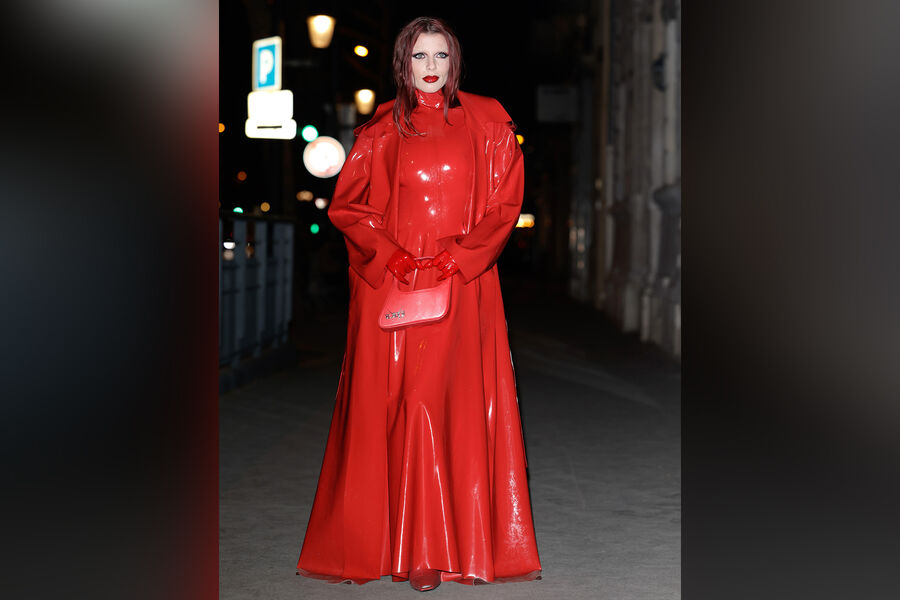 33-летняя Джулия Фокс надела на мероприятие ярко-красный комплект из платья и пальто, полностью сделанный из латекса. Бывшая возлюбленная рэпера Канье Уэста дополнила образ ботильонами на каблуке, высокими перчатками и миниатюрным клатчем в тон. Актриса сделала «мокрую» укладку и яркий макияж с графичными стрелками и красной помадой.