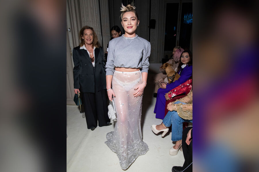 27-летняя Флоренс Пью пришла на показ в серебристом кроп-топе и прозрачной белой юбке, расшитой стразами, из-под которой просвечивалось нижнее белье. Звезда «Маленьких женщин» дополнила образ сумочкой от Valentino и ювелирным комплектом с бриллиантами. Актриса собрала волосы в небрежный пучок и сделала нюдовый макияж с акцентом на глаза.