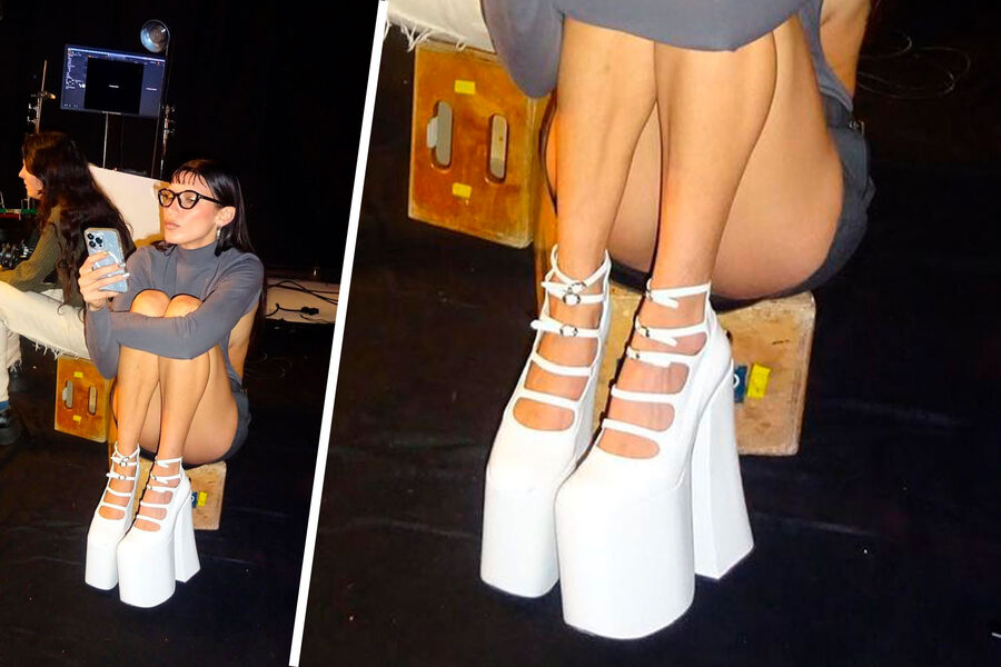 26-летняя супермодель позировала сидя на коробке в сером мини-платье с голой спиной и высоким воротом. Образ дополнили босоножки с ремешками, на платформе и высоких каблуках. Волосы модель выпрямила и сделала челку-шторку.