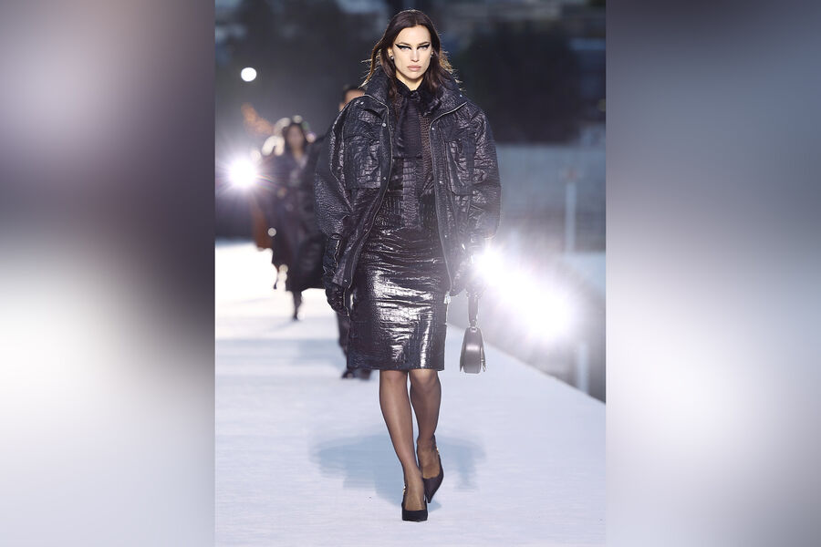 37-летняя Ирина Шейк дефилировала в кожаном total look'е. На ней были блуза с бантом, юбка-карандаш, куртка и перчатки — и все с тиснением под «крокодила». Образ дополнили сумка, черные капроновые колготки и туфли на шпильке. Волосы модели были распущены, а в макияже был сделан акцент на графичные стрелки.