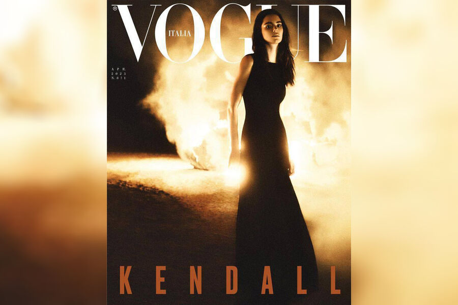 Кендалл Дженнер снялась для обложки итальянского Vogue в черном макси-платье на фоне горящего пламя. Съемку стилизовала Кейт Пелан, а фотографом выступил Робин Галига. Модель позировала в образах от брендов Max Mara, Dior, Chloé и Loewe.