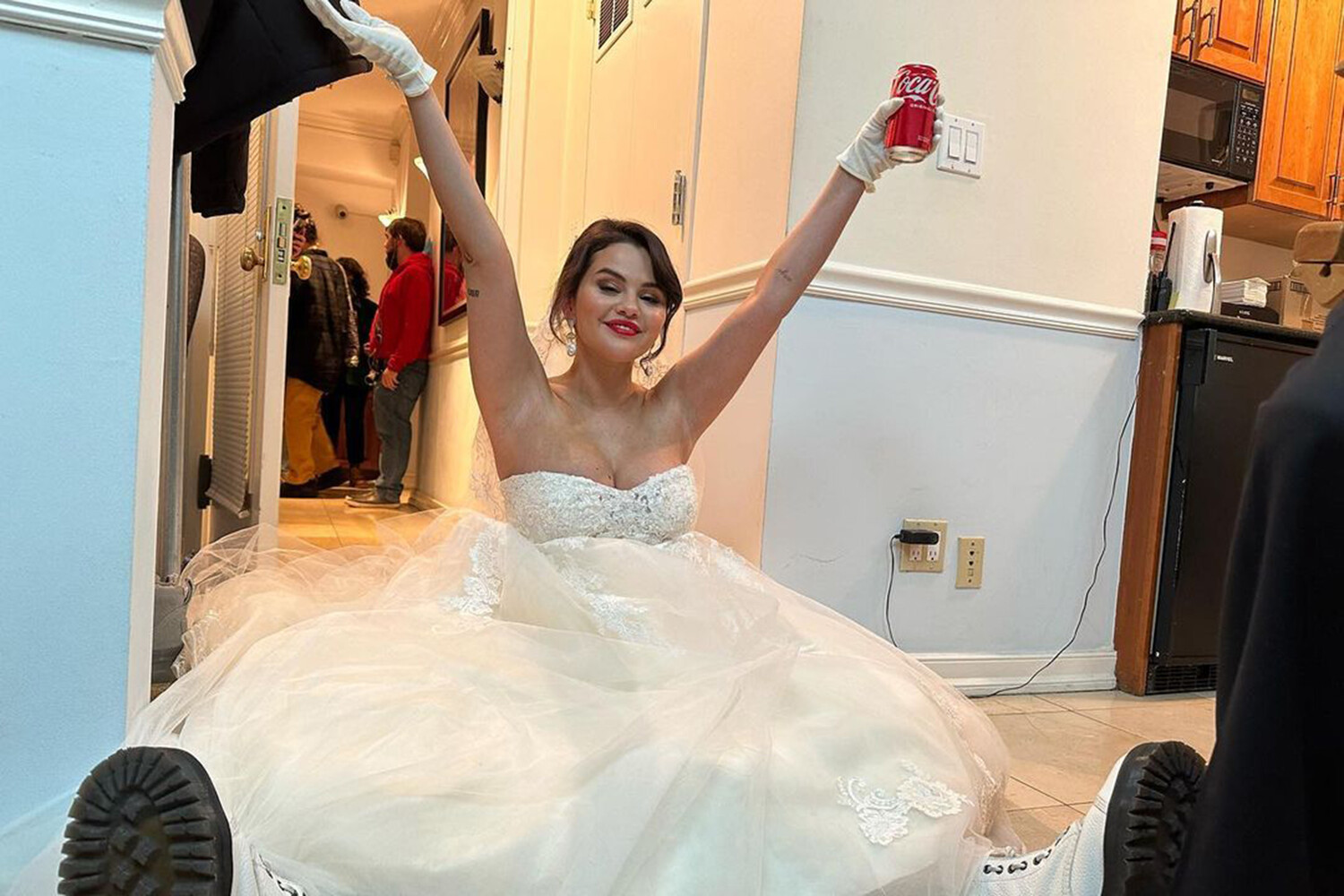 30-летняя Селена Гомес примерила образ невесты на съемочной площадке третьего сезона сериала «Убийства в одном здании». Актрису одели в белое свадебное платье с открытыми плечами и пышной юбкой, фату с кружевом и перчатки. Стилисты собрали ее волосы в пучок, а визажисты сделали ей макияж с красной помадой.