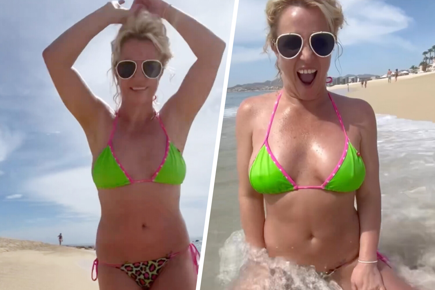 41-летняя Бритни Спирс выложила в социальных сетях видеоролик, снятый во время отдыха. В кадре она предстала в крошечном купальнике, состоящем из треугольного лифа неоново-зеленого цвета и плавок-бикини на завязках с леопардовым принтом. Певица позировала, лежа на песке и плескась в волнах.