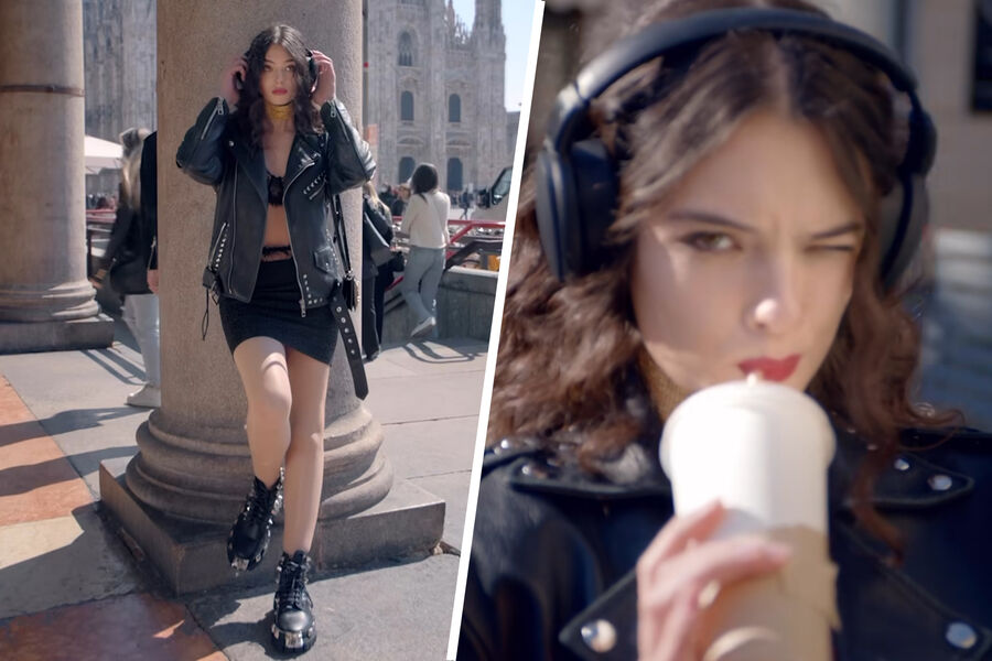 В опубликованном видео 18-летняя Дева гуляет по улицам Милана, слушая музыку в наушниках и пританцовывая в такт. Она одета в кожаную куртку, кружевное бра, мини-юбку и ботинки на шнуровке.