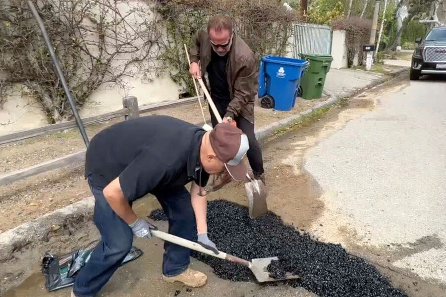 75-летний актер и бывший губернатор Калифорнии Арнольд Шварценеггер вышел на улицу своего района в Лос-Анджелесе, чтобы засыпать огромную выбоину в асфальте, так как ему надоело ждать, пока ее заделают. Актер выложил в личном блоге видеоролик, в котором показал, как они с помощником засыпают яму бетоном.