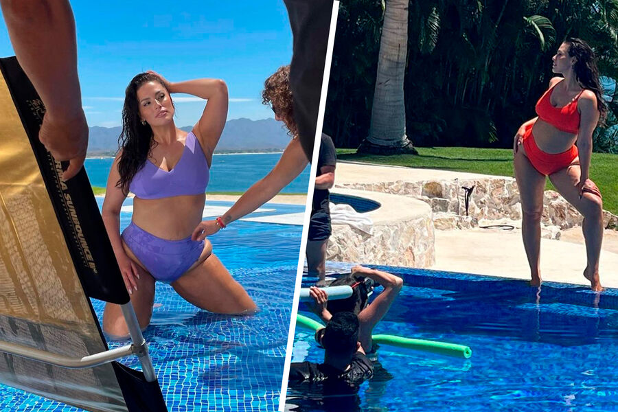 35-летняя Эшли Грэм опубликовала в социальных сетях бэкстейдж-кадры со съемок рекламы купальников бренда Knix, в которой она приняла участие в качестве модели. На снимках модель позирует у бассейна в бикини лавандового и оранжевого цвета.
