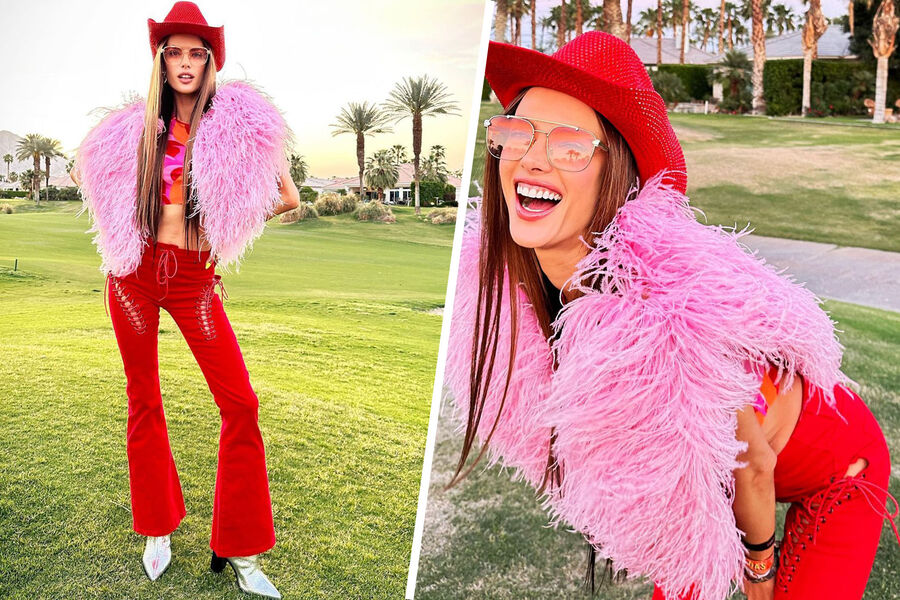 41-летняя Алессандра Амбросио снялась в оранжевом топе, красных брюках с разрезами и шнуровкой и розовой шубе. Образ дополнила красная ковбойская шляпа.