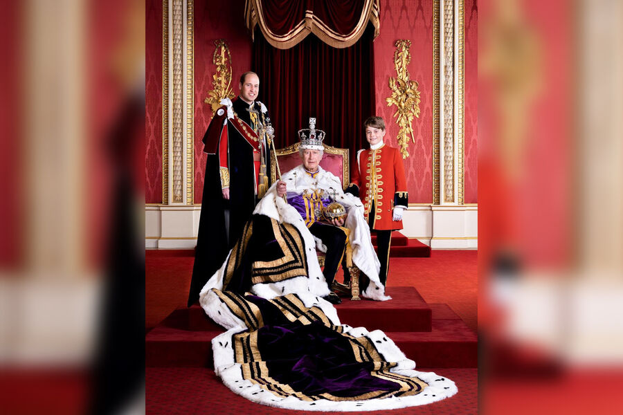 По правую руку от короля Великобритании стоит его старший сын, 40-летний принц Уильям, а по левую — девятилетний внук, принц Джордж. Уильям одет в парадную военную форму, а Джордж — в форму почетного королевского пажа, роль которого он исполнил во время коронации.