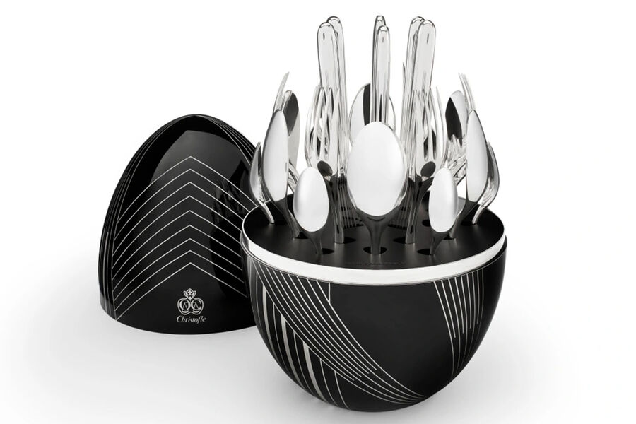 Выставленный на торги экземпляр является одной из особенно редких версий в черном лаке, с выгравированным гербом Christofle и подписью Лагерфельда. В футляре в форме яйца содержится набор посеребренных столовых приборов из 24 предметов.