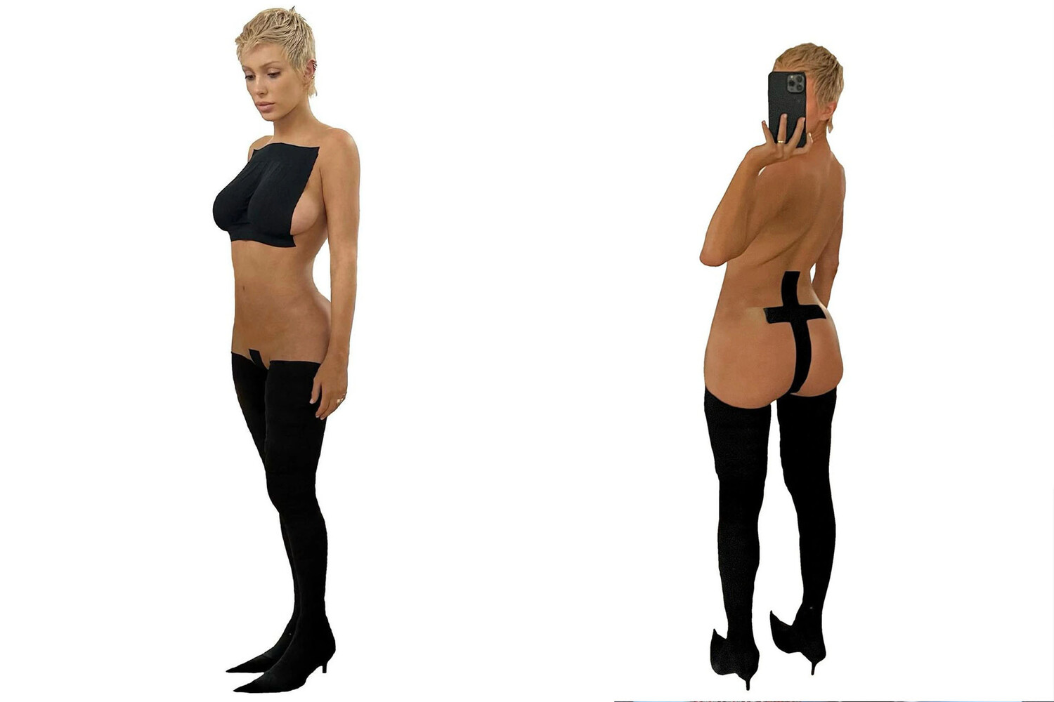 27-летняя Бьянка Сенсори позировала в высоких черных сапогах на шпильке с острыми мысами. Жена рэпера прикрыла интимные части тела черными тейпами, смоделировав из них топ и трусы-стринги. Уточняется, что необычный «наряд» был создан для Yeezy 28-летним модельером нигерийского происхождения Мовалолой Огунлеси, которая известна своими нетрадиционными силуэтами.
