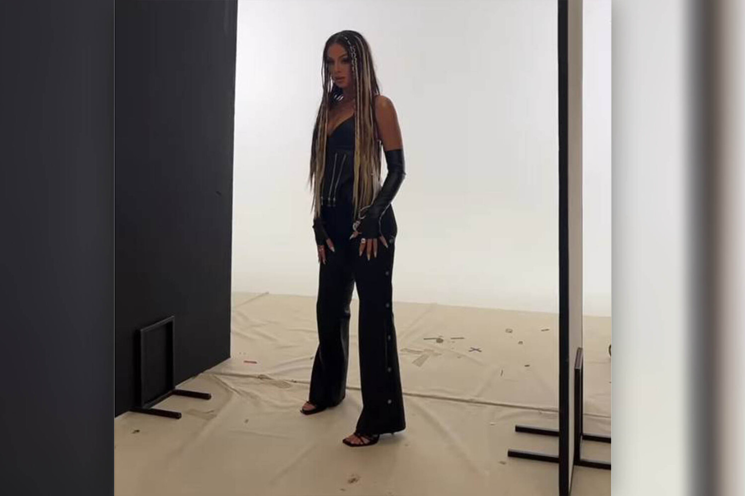 32-летняя певица снялась в кожаном корсете, брюках и перчатках. Образ дополнили туфли на высоких каблуках и массивные кольца. Певице заплели косички и сделали вечерний макияж. Съемка проходила в фотостудии, однако детали и повод певица не сообщила.