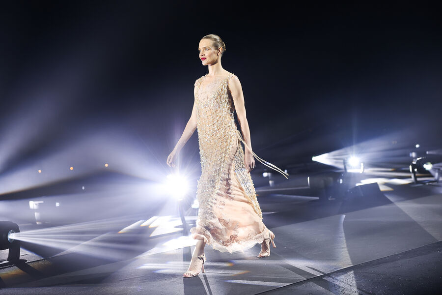 В минувшую среду, 14 июня, на площади Микеланджело во Флоренции состоялось шоу «Иконы подиума», организованное ретейлером LuisaViaRoma в коллаборации с журналом British Vogue. В дефиле приняла участие супермодель Наталья Водянова. 41-летняя россиянка продемонстрировала на себе сразу два эффектных образа — телесное платье-сетку и пышное мини со шлейфом из шифона.