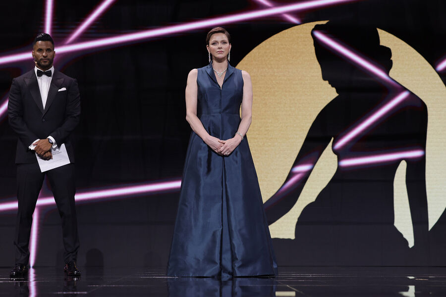 45-летняя княгиня Шарлен выбрала для выхода на красную ковровую дорожку шелковое платье в пол Akris королевского синего цвета. Приталенный фасон и V-образный вырез комплиментарно подчеркнули фигуру монаршей особы.