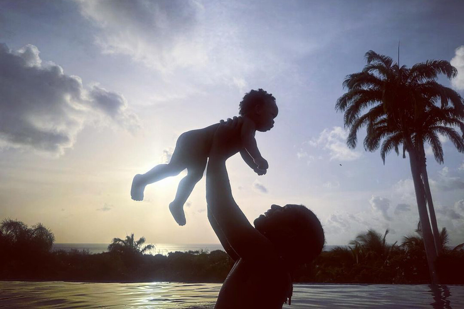 На одном из снимков возлюбленный Рианны, рэпер A$AP Rocky, позирует на фоне океана и держит на руках их 13-месячного сына RZA.