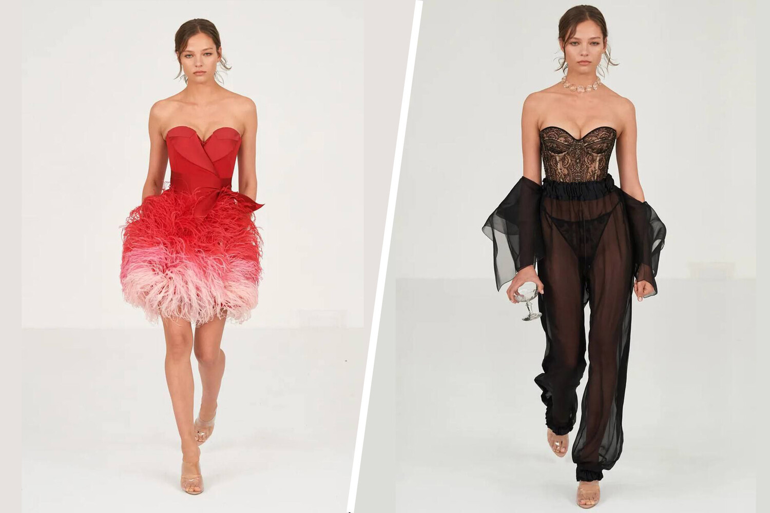 Модель Алеся Кафельникова вышла на показе бренда Alexis Mabille. Первым образом стал наряд с кружевными корсетом и стрингами, а также «голыми» брюками. Вторым — мини-платье с глубоким декольте и перьями на юбке.