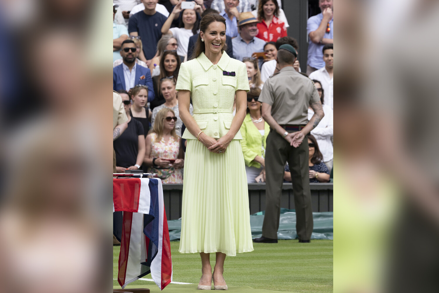 41-летняя принцесса Уэльская, которая является патроном Всеанглийского клуба тенниса и крокета, появилась на теннисном матче в платье-миди из лаймового букле и шифона и с фиолетово-зеленой лентой Уимблдона. Она наблюдала за игрой туниски Онс Жабер и чешки Маркеты Вондроушовой.