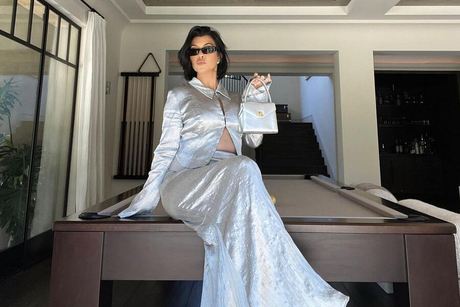 Беременная Корни Кардашьян позировала перед камерой в серебряном комплекте из юбки и рубашки российского бренда Sorelle. Стоимость юбки составляет всего 14 300 рублей, а блузки — 14 300 рублей. Образ она дополнила сумочкой в тон и солнцезащитными очками.