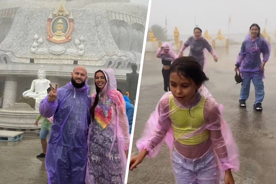 Пара вместе с детьми отправилась смотреть на статую Будды, но там их ждал неприятный сюрприз. Семья попала в ураган с сильным ветром и дождем. Дети были одеты в дождевики, но, как рассказала Самойлова, специальная одежда им не помогла. Они спрятались в одной из построек и решили переждать непогоду.