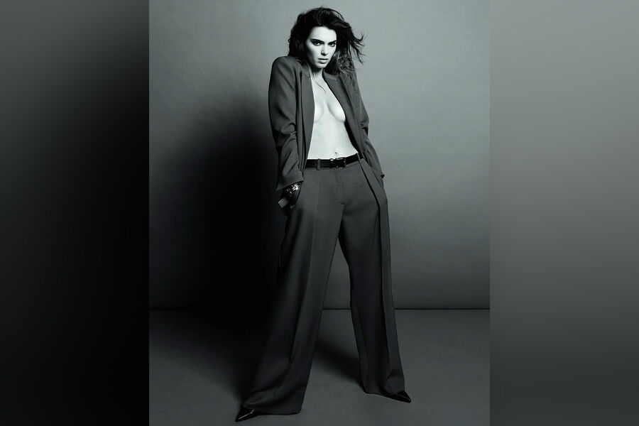 27-летняя супермодель продемонстрировала образы из осенней коллекции бренда. На одном из черно-белых снимков Кендалл Дженнер запечатлена в широких брюках со стрелками и пиджаке на голое тело. На другом фото звезда позировала в маленьком черном платье с вырезом под грудью и высоких ковбойских сапогах. Для фотосессии Кендалл сделали дымчатый макияж глаз и подчеркнули губы бежевой матовой помадой.