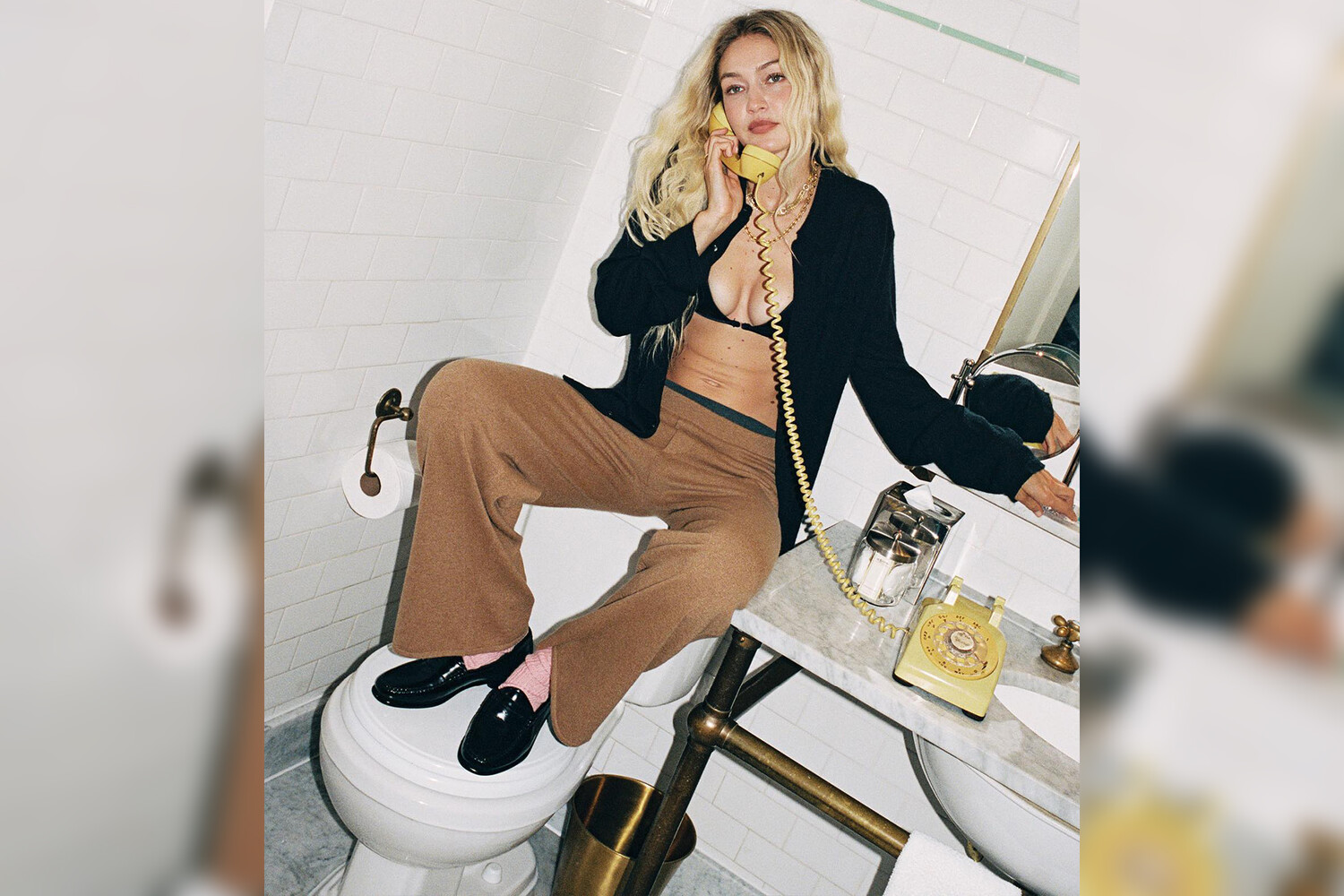 28-летняя Джиджи Хадид снялась в рекламной кампании своего нового бренда трикотажа Guest In Residence. На одном из фото модель запечатлена сидящей на бочке унитаза. Звезда подиума была одета в кашемировые брюки песочного цвета и миниатюрный черный бюстгальтер, поверх которого она накинула черный кардиган. Джиджи Хадид уложила волосы на мотив голливудских волн и сделала легкий макияж в нюдовых оттенках.