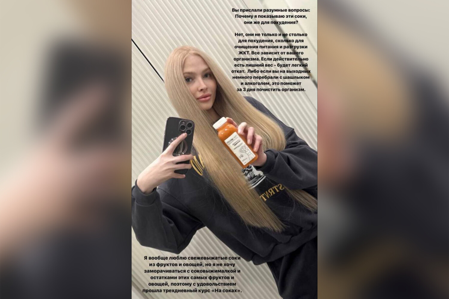 Бывшая возлюбленная Тимати добавила, что любит свежевыжатые соки, но не любит «заморачиваться с соковыжималкой», поэтому «с удовольствием прошла трехдневный курс на соках».