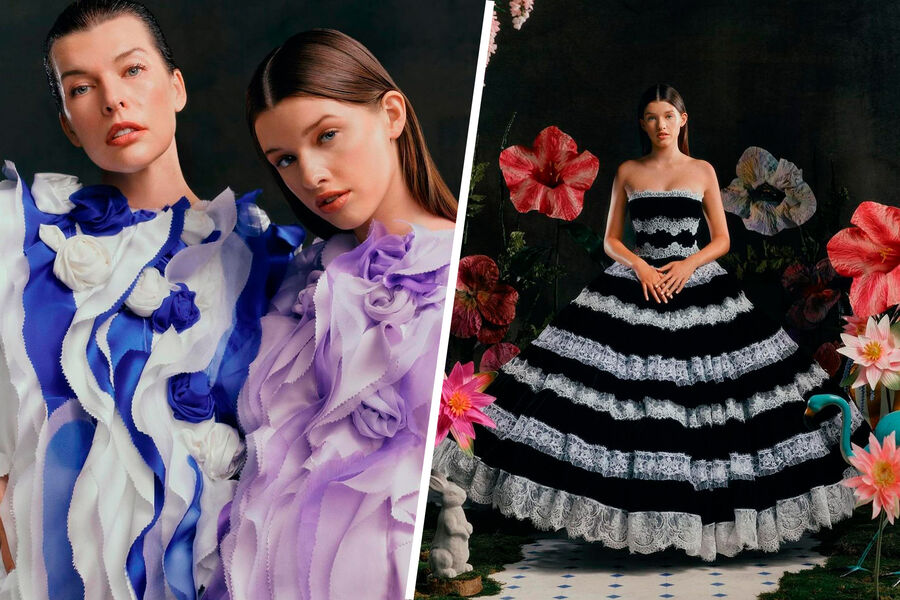 47-летняя Милла Йовович и 15-летняя Эвер Андерсон стали героинями модной съемки бренда Rodarte. Актриса и ее дочь позировали фэшн-фотографу Дарье Кобаяши Рич в платьях из новой коллекции марки на фоне цветочных композиций.