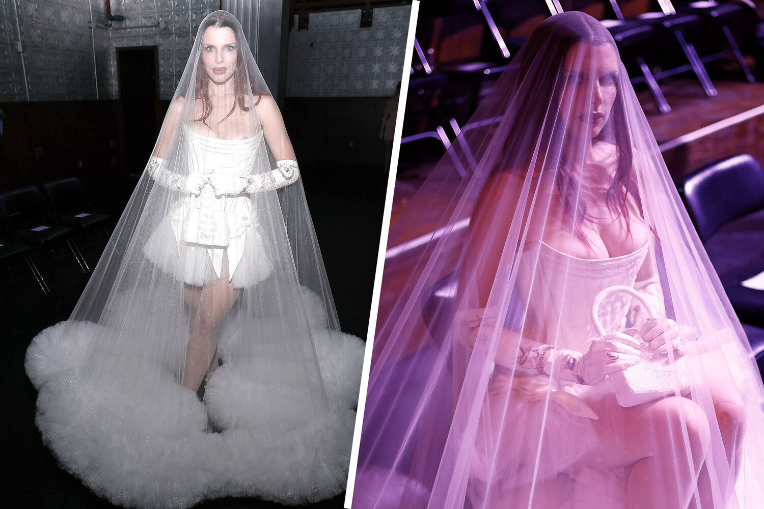 33-летняя Джулия Фокс появилась на модном шоу в корсетном мини-платье из свадебной коллекции бренда с длинной фатой, которая полностью покрыла тело модели. Бывшая девушка Канье Уэста дополнила образ высокими перчатками с вышивкой, белыми туфлями на высокой платформе и миниатюрной белой сумкой. Актриса распустила волосы и сделала яркий макияж с акцентом на матовую коричневую помаду.