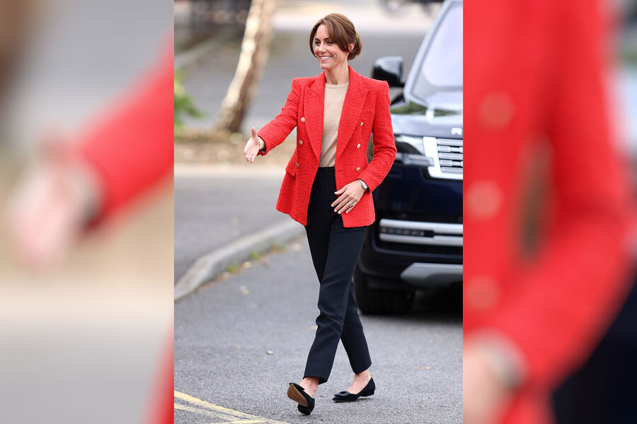 Кейт Миддлтон предпочла для выхода твидовый пиджак испанского бренда массмаркета Zara, который надела поверх бежевой футболки. Образ завершили классические брюки и бархатные балетки. В жакете принцесса Уэльская уже появлялась на публике, когда с официальным визитом была в 2022 году в Копенгагене. Тогда она надела его вместе с белой рубашкой с рюшами.
