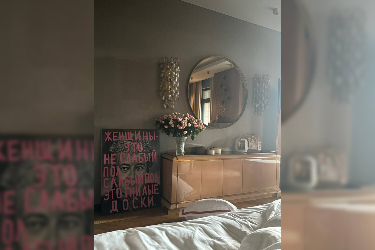 Ксения Собчак сделала редкое фото из кровати. Она показала интерьер спальни: розовый комод, современная картина, зеркало, стеклянные вазы и светильники.