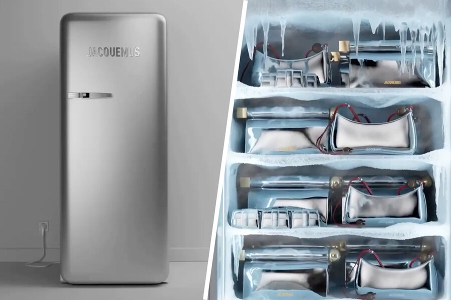 Бренд Jacquemus представил сумки металлизированного оттенка. На каждой полке морозильника была анонсирована модель из коллекции бренда. На видео все изделия тряслись от холода.