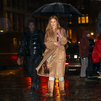 Папарацци засняли Николь Кидман во время съемок эротического триллера «Малышка» в Нью-Йорке. Голливудская актриса была одета в бежевое пальто, серые спортивные брюки и угги. Она была запечатлена с распущенными волосами и ярким макияжем.