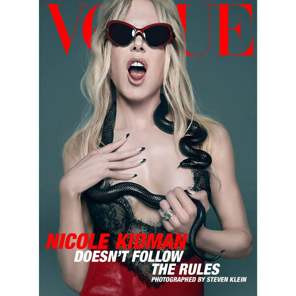 56-летняя Николь Кидман снялась в откровенном образе. Знаменитость предстала перед фотографом в красном платье-комбинации, которое было украшено черным кружевом. Стилисты также добавили к наряду актрисы солнцезащитные очки в бордовой оправе и серебряные кольца. У Николь Кидман была небрежная укладка и нюдовый макияж с розовым блеском. Актриса держала в руке черную змею, которая обвила ее вокруг шеи и скользила по ее груди. Фотографом съемки выступил Стивен Кляйн.