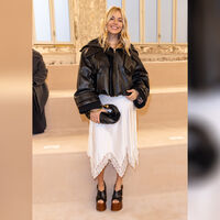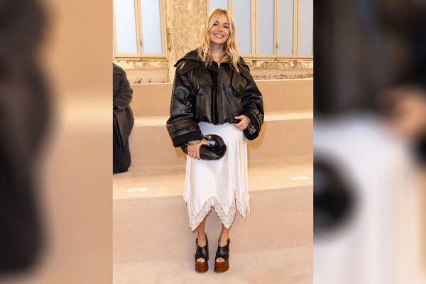 41-летняя Сиенна Миллер вышла на публику в белоснежном платье-комбинации с отделкой из кружева, поверх которого надела кожаную дубленку. Образ завершили туфли на высокой платформе.