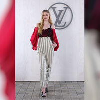 28-летняя Софи Тернер пришла на показ в брюках с высокой талией и подтяжками, блузе со спущенными рукавами и глубоким декольте. Ей также сделали укладку с мягкими локонами и вечерний макияж.