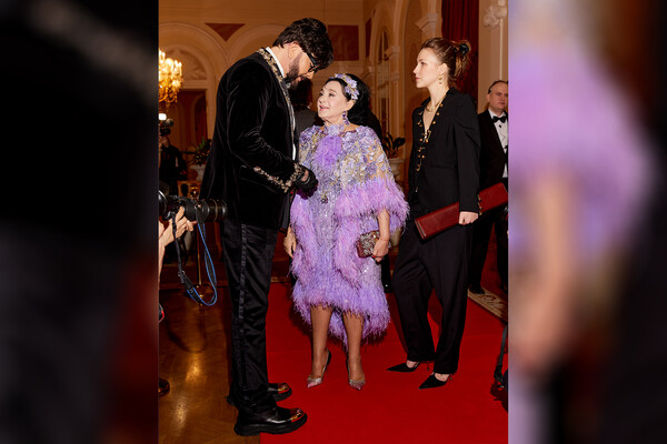 75-летняя Ирина Винер вышла в свет в фиолетовом платье-миди, которое было украшено пайетками и перьями. Она дополнила наряд ободком с цветами в тон, массивными серьгами с лиловыми камнями, цепочкой с кулоном, клатчем со стразами и блестящими туфлями на каблуках розового цвета. Визажисты сделали ей макияж с черными стрелками и нюдовой помадой, а стилисты — объемную укладку. На мероприятии фотографы засняли, как Ирина Винер беседовала с певцом Филиппом Киркоровым.