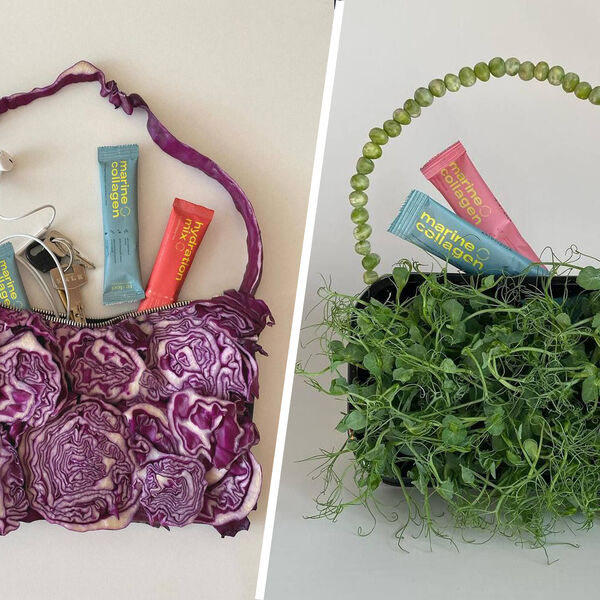 В рекламе бренд показал сумки из капусты, гороха, физалиса, салата и других растений. Изделия наполнили разными пакетиками со смесями для напитков.