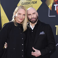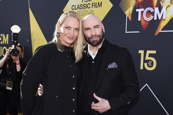 В этот день культовому фильму Квентина Тарантино «Криминальное чтиво» исполнилось 30 лет. Турман, которая сыграла в картине жену босса мафии Мию Уоллес, пришла на мероприятие в облегающем джемпере, элегантном кардигане с металлическими пуговицами и в брюках свободного кроя. Джон Траволта, исполнивший роль наемника Винсента Веги, пришел в белой рубашке, джинсах и жакете.