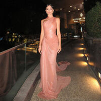 Перед камерой 33-летняя Нюша позировала в бежево-пудровом «голом» платье. Ей сделали ретро укладку с прядями и вечерний макияж с хайлайтером. Образ дополнили браслеты и кольца с бриллиантами. Певица получила премию в номинации «Модный артист года» и поблагодарила жюри за выбор.