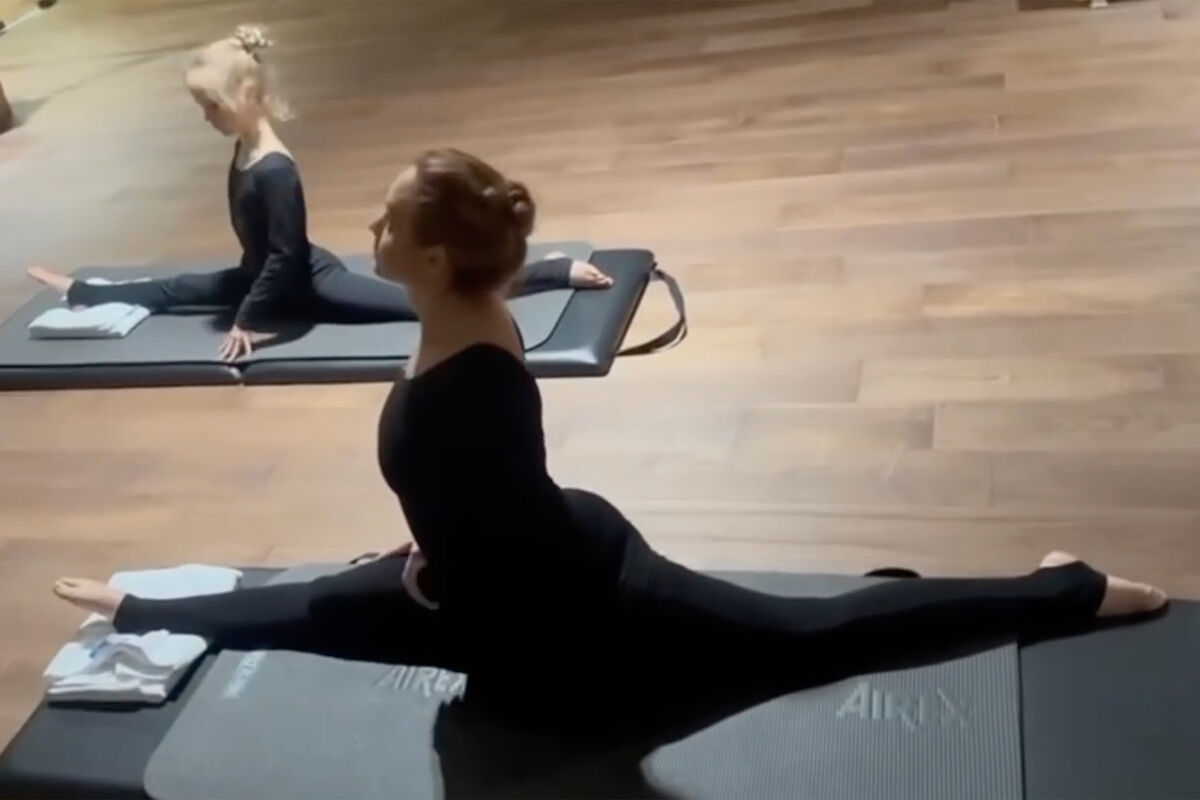 Перед камерой 40-летняя МакSим (настоящее имя — Марина Абросимова) предстала в черном боди, которое дополнила леггинсами в тон. Певица собрала волосы в пучок и отказалась от макияжа. Артистка сидела на продольном шпагате вместе со своей младшей дочерью Марией. Поклонники исполнительницы восхитились ее растяжкой.