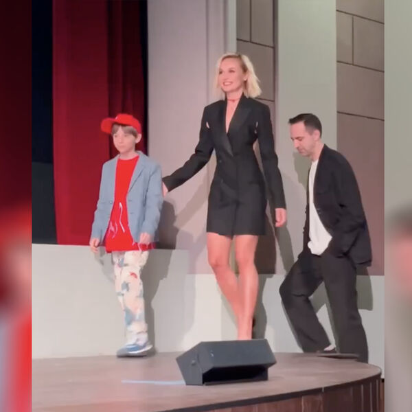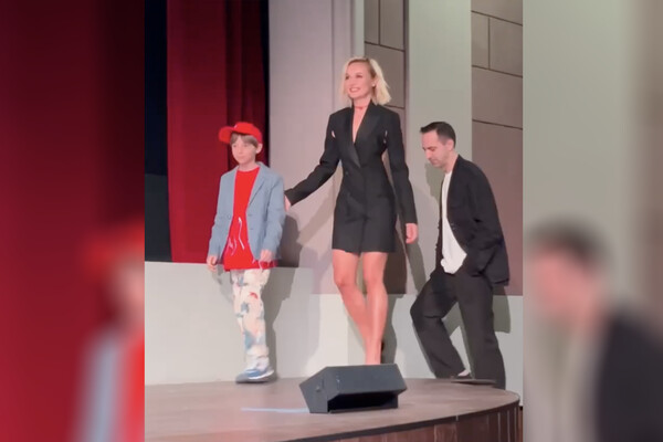 Полина Гагарина предпочла для выхода на публику черное мини-платье с открытой спиной и лодочки на высоких каблуках. Ей также сделали укладку с локонами и вечерний макияж. На сцену она вышла вместе со своим экранным сыном — 10-летним Евгением Писаревым.